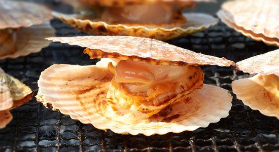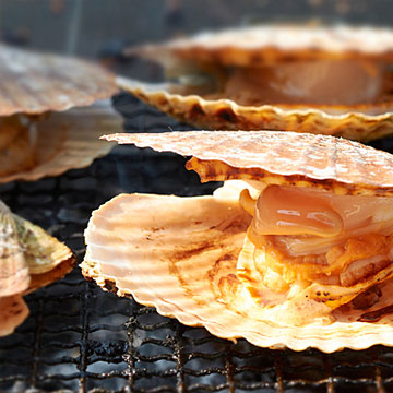 噴火湾でとれた魚貝類のあぶり焼きにはその日に仕入れた新鮮な素材を使っています。